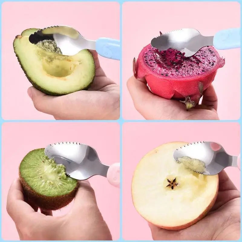 معلقة أطفال 2 في 1 جزء سيليكون وأخر استانليس لتناول الأطعمة السائلة وكشط الفواكه والخضروات