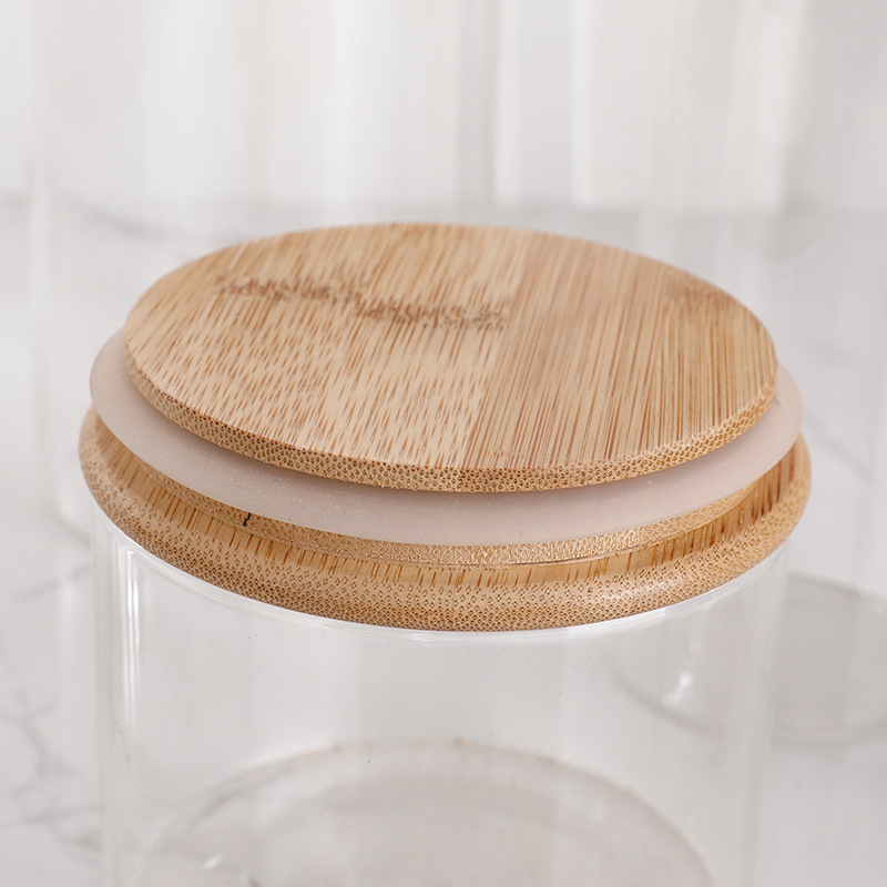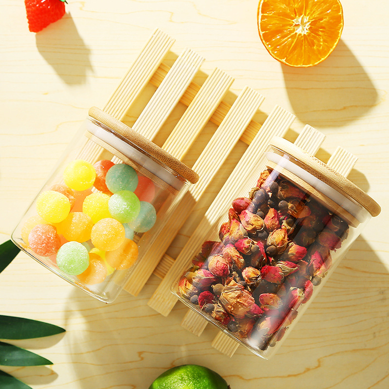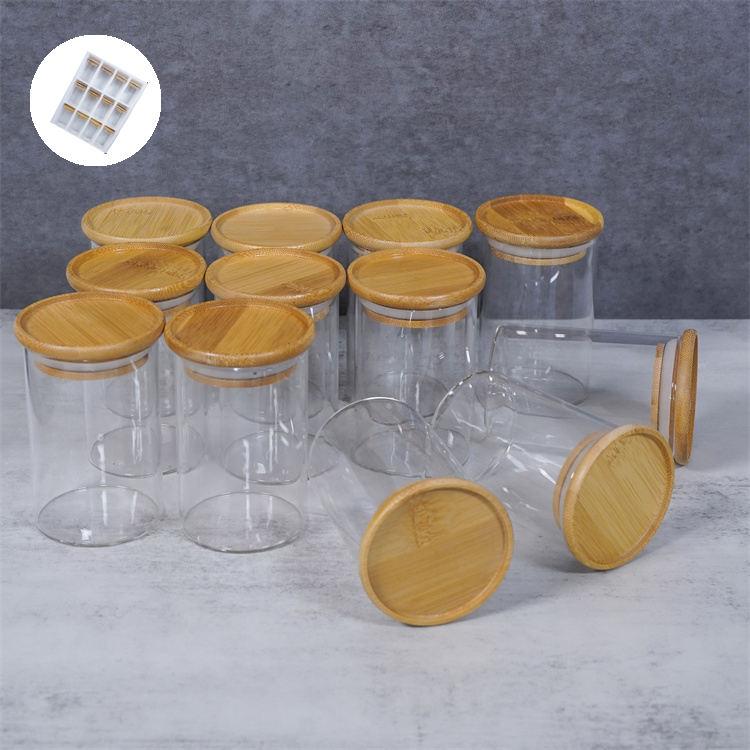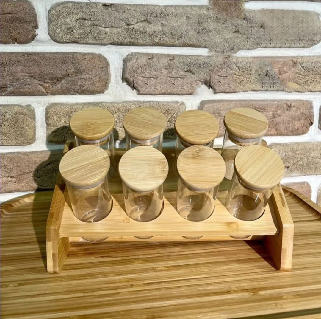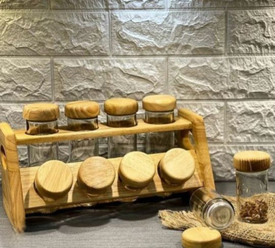 طقم توابل يتكون من 8 برطمانات زجاج شفاف بغطاء خشبي محكم الغلق