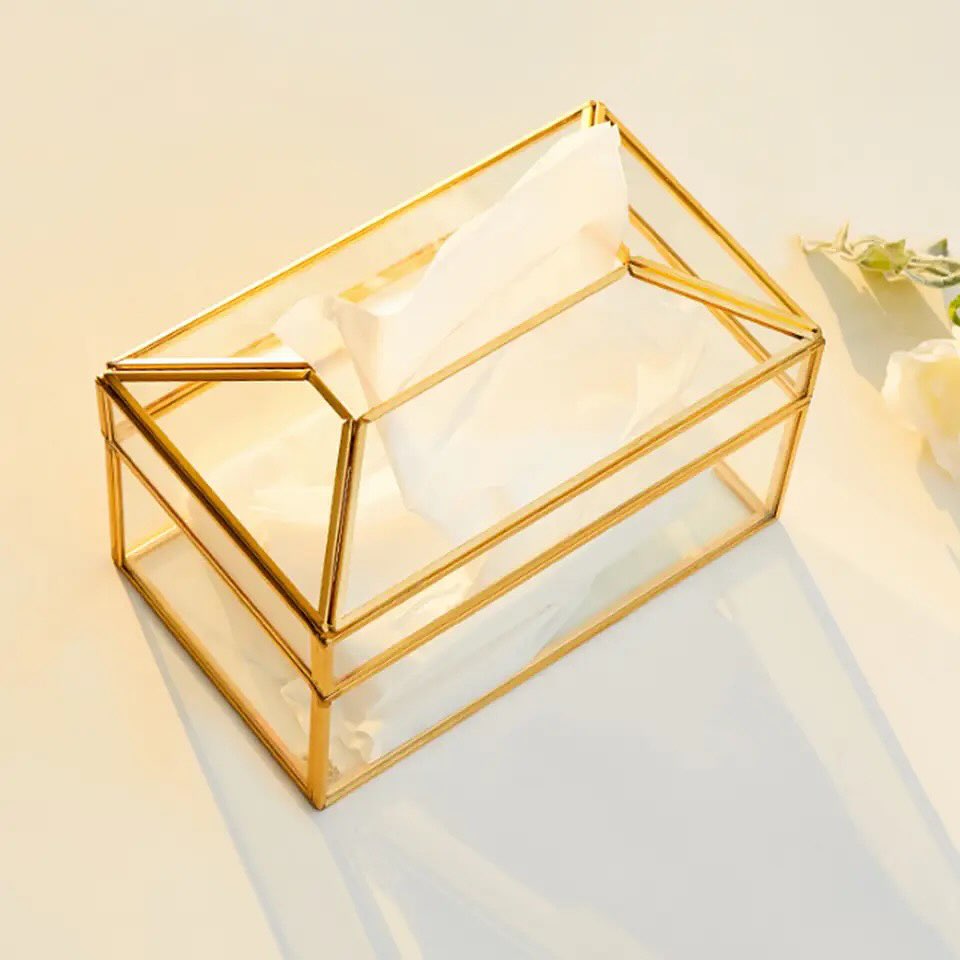 علبة مناديل شيك بحواف جولد لغرف النوم والليفنج والمكتب من الزجاج والمعدن