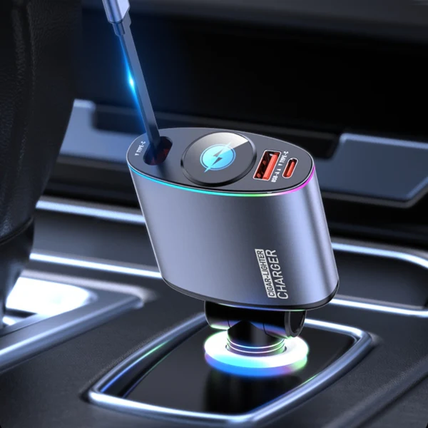 شاحن سيارة سريع للموبايلات 3*1 كابل قابل للسحب ومنفذ يو اس بي